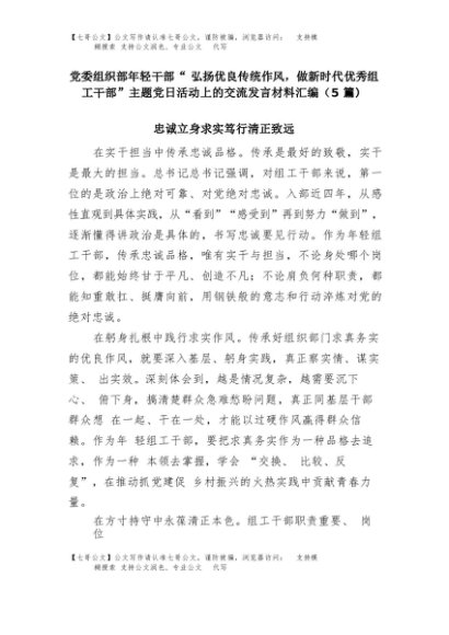 【七哥公文】2025年:(5篇)党委组织部年轻干部“弘扬优良传统作风,做新时代优秀组工干部”主题党日活动上的交流发言材料汇编+更多免费公文+VX:QiGeGongWen2024