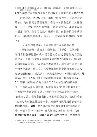 【七哥公文】2025年:2025年第三季度预备党员入党积极分子思想汇报(1897字)+更多免费公文+VX:QiGeGongWen2024