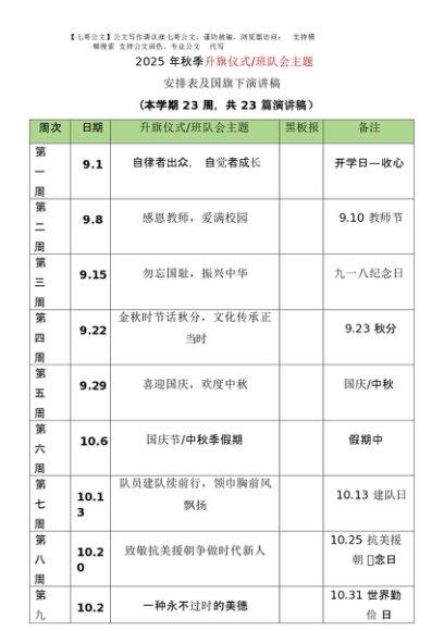 【七哥公文】2025年:2025年秋季学期升旗仪式安排表及演讲稿+更多免费公文+VX:QiGeGongWen2024