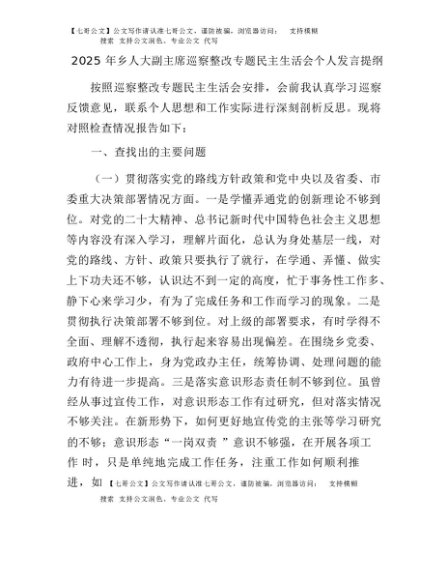 【七哥公文】2025年:2025年乡人大副主席巡察整改专题民主生活会个人发言+更多免费公文+VX:QiGeGongWen2024