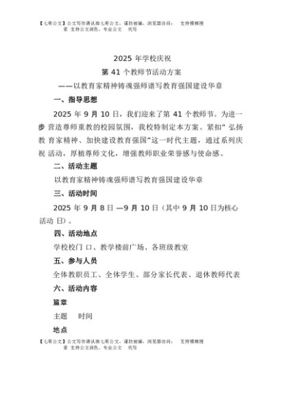 【七哥公文】2025年:2025年学校庆祝第41个教师节活动方案-以教育家精神铸魂强师谱写教育强国建设华章+更多免费公文+VX:QiGeGongWen2024
