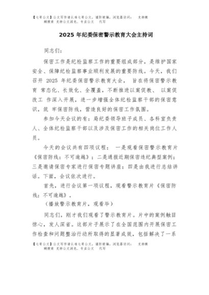 / 【七哥公文】2025年:2025年纪委保密警示教育大会主持词+更多免费公文+VX:QiGeGongWen2024