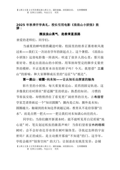【七哥公文】2025年:2025年秋季开学典礼,校长引用电影《浪浪山小妖怪》致辞:携浪浪山勇气,赴教育星辰路+更多免费公文+VX:QiGeGongWen2024