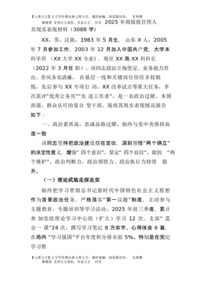 【七哥公文】2025年:2025年拟提拔任用人员现实表现材料(3088字)+更多免费公文+VX:QiGeGongWen2024