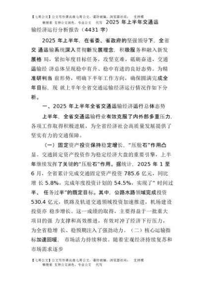 【七哥公文】2025年:2025年上半年交通运输经济运行分析报告(4431字)+更多免费公文+VX:QiGeGongWen2024