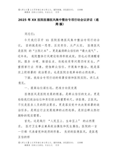 【七哥公文】2025年:2025年XX医院医德医风集中整治专项行动会议讲话(通用版)+更多免费公文+VX:QiGeGongWen2024