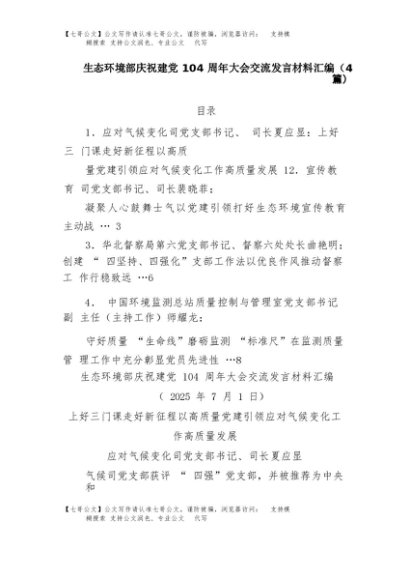 【七哥公文】2025年:(4篇)生态环境部庆祝建党104周年大会交流发言材料汇编+更多免费公文+VX:QiGeGongWen2024