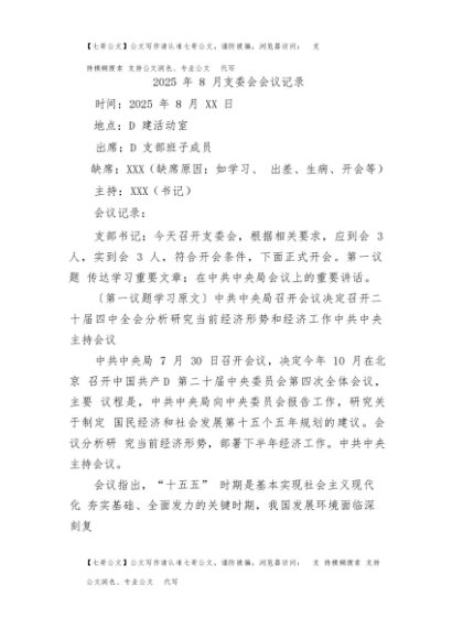 / 【七哥公文】2025年:2025年8月支委会会议记录+更多免费公文+VX:QiGeGongWen2024