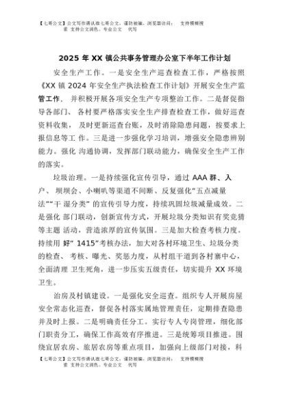 【七哥公文】2025年:2025年XX镇公共事务管理办公室下半年工作计划+更多免费公文+VX:QiGeGongWen2024