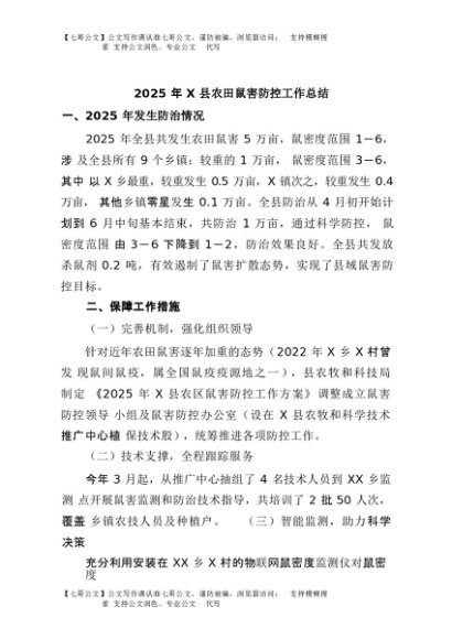 / 【七哥公文】2025年:2025年X县农田鼠害防控工作总结+更多免费公文+VX:QiGeGongWen2024