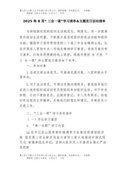 【七哥公文】2025年:2025年8月“三会一课”学习清单&主题党日活动清单+更多免费公文+VX:QiGeGongWen2024