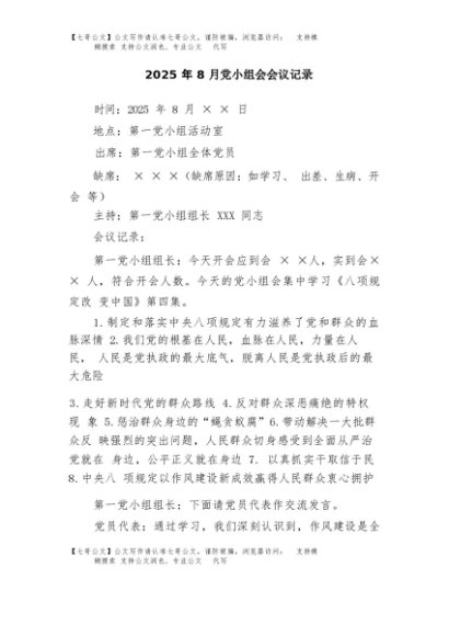 / 【七哥公文】2025年:2025年8月党小组会会议记录+更多免费公文+VX:QiGeGongWen2024