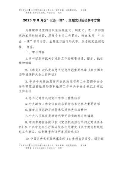 【七哥公文】2025年:2025年8月份“三会一课”、主题党日活动参考方案+更多免费公文+VX:QiGeGongWen2024