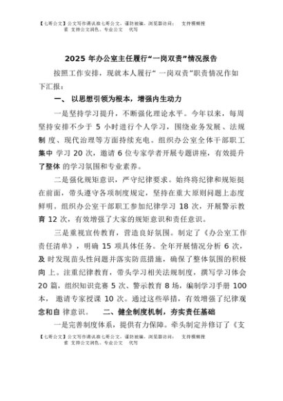 / 【七哥公文】2025年:2025年办公室主任履行“一岗双责”情况报告+更多免费公文+VX:QiGeGongWen2024