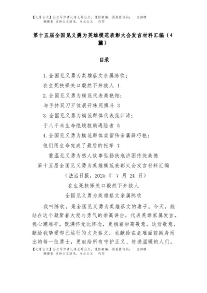 【七哥公文】2025年:(4篇)第十五届全国见义勇为英雄模范表彰大会发言材料汇编+更多免费公文+VX:QiGeGongWen2024