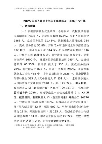 / 【七哥公文】2025年:2025年区人社局上半年工作总结及下半年工作打算+更多免费公文+VX:QiGeGongWen2024