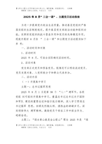 【七哥公文】2025年:2025年8月“三会一课”、主题党日活动指南+更多免费公文+VX:QiGeGongWen2024