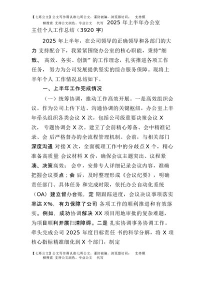 【七哥公文】2025年:2025年上半年办公室主任个人工作总结(3920字)+更多免费公文+VX:QiGeGongWen2024