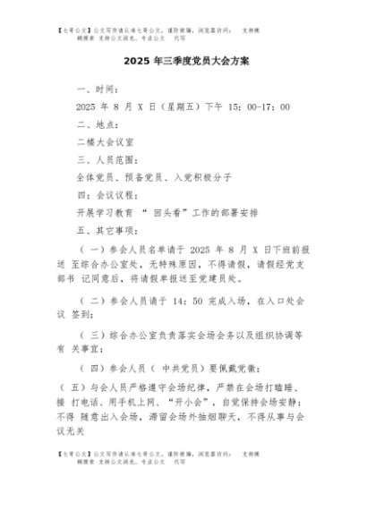 / 【七哥公文】2025年:2025年三季度党员大会方案+更多免费公文+VX:QiGeGongWen2024