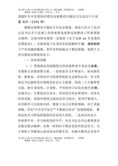 【七哥公文】2025年:2025年乡党委组织委员巡察整改专题民主生活会个人发言提纲(2192字)+更多免费公文+VX:QiGeGongWen2024