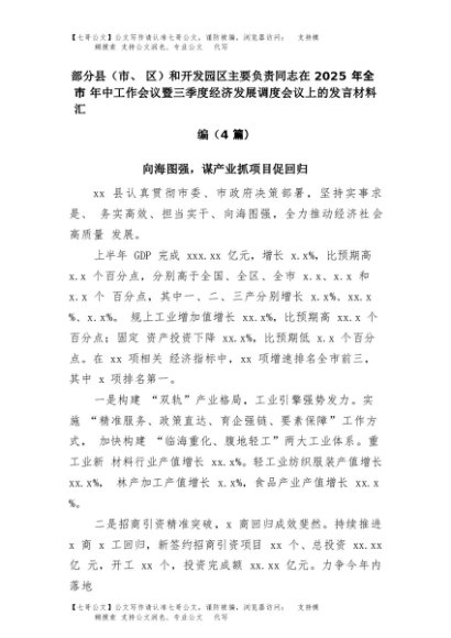 【七哥公文】2025年:(4篇)部分县(市、区)和开发园区主要负责同志在2025年全市年中工作会议暨三季度经济发展调度会议上的发言材料汇编+更多免费公文+VX:QiGeGongWen2024