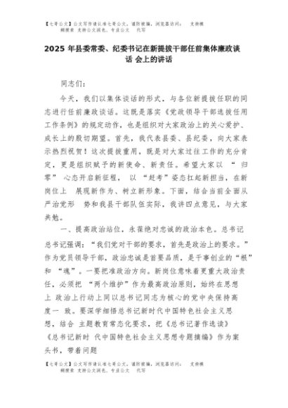 【七哥公文】2025年:2025年县委常委、纪委书记在新提拔干部任前集体廉政谈话会上的讲话+更多免费公文+VX:QiGeGongWen2024