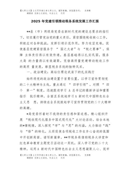 / 【七哥公文】2025年:2025年党建引领推动税务系统发展工作汇报+更多免费公文+VX:QiGeGongWen2024