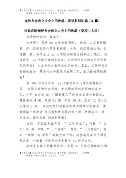 【七哥公文】2025年:(4篇)在校友会成立大会上的致辞、讲话材料汇编+更多免费公文+VX:QiGeGongWen2024