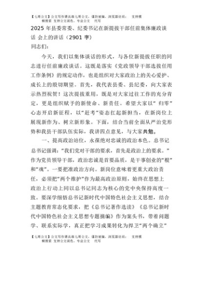 【七哥公文】2025年:2025年县委常委、纪委书记在新提拔干部任前集体廉政谈话会上的讲话(2901字)+更多免费公文+VX:QiGeGongWen2024