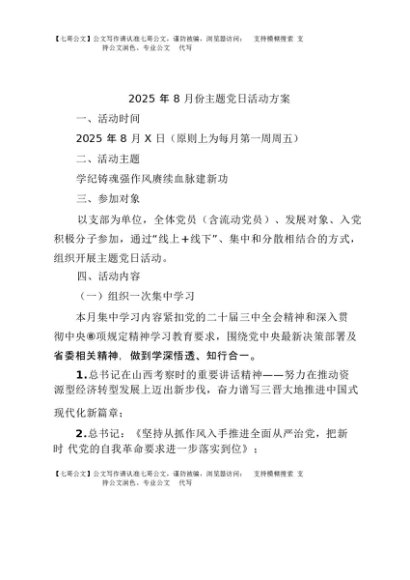 / 【七哥公文】2025年:2025年8月份主题党日活动方案+更多免费公文+VX:QiGeGongWen2024