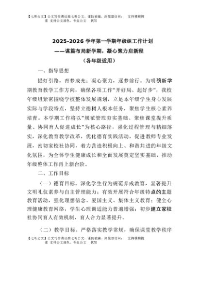 【七哥公文】2025年:2025-2026学年第一学期年级组工作计划——谋篇布局新学期,凝心聚力启新程+更多免费公文+VX:QiGeGongWen2024
