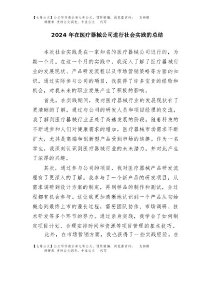 / 【七哥公文】2025年:2024年在医疗器械公司进行社会实践的总结+更多免费公文+VX:QiGeGongWen2024