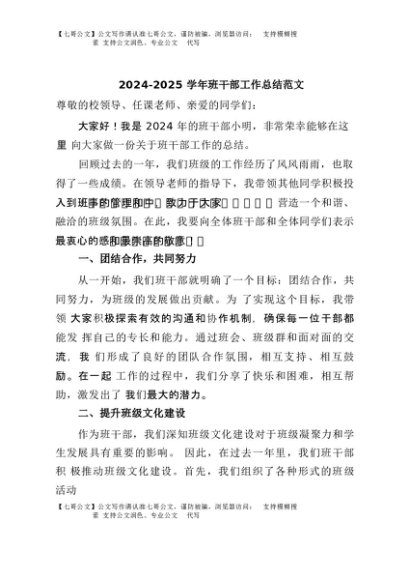 【七哥公文】2025年:2024-2025学年班干部工作总结范文+更多免费公文+VX:QiGeGongWen2024