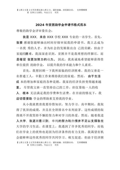 【七哥公文】2025年:2024年贫困助学金申请书格式范本+更多免费公文+VX:QiGeGongWen2024