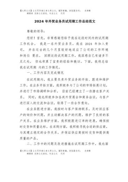 【七哥公文】2025年:2024年外贸业务员试用期工作总结范文+更多免费公文+VX:QiGeGongWen2024