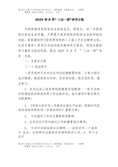 / 【七哥公文】2025年:2025年8月“三会一课”参考方案+更多免费公文+VX:QiGeGongWen2024