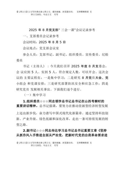 / 【七哥公文】2025年:2025年8月党支部“三会一课”会议记录参考+更多免费公文+VX:QiGeGongWen2024