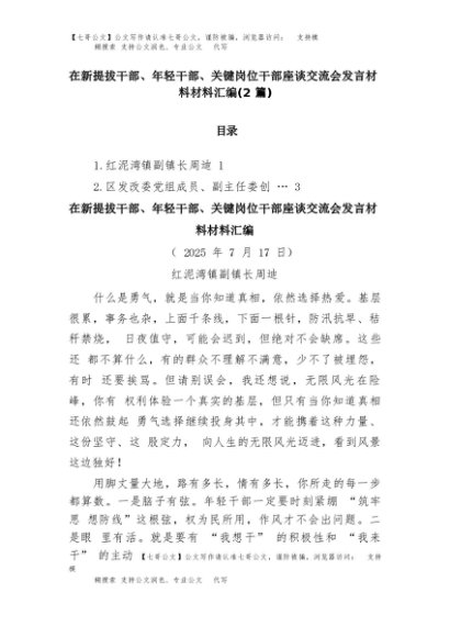 【七哥公文】2025年:(2篇)在新提拔干部、年轻干部、关键岗位干部座谈交流会发言材料材料汇编+更多免费公文+VX:QiGeGongWen2024