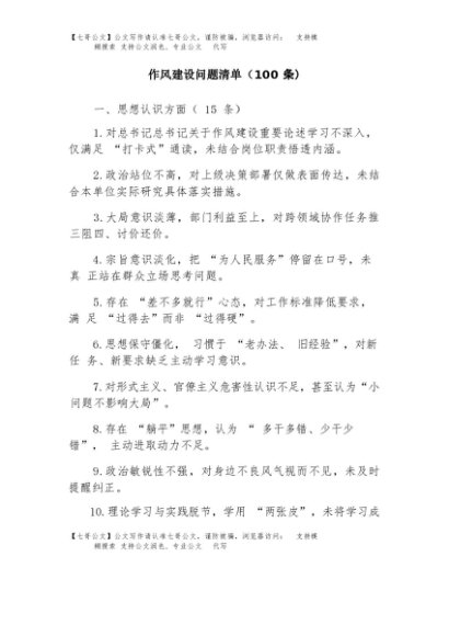【七哥公文】2025年:(100条)作风建设问题清单+更多免费公文+VX:QiGeGongWen2024
