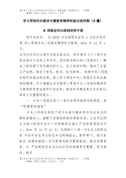 【七哥公文】2025年:(3篇)学习贯彻作风建设专题教育精神经验交流材料+更多免费公文+VX:QiGeGongWen2024