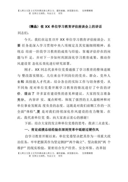 / 【七哥公文】2025年:(精品)在XX单位学习教育评估座谈会上的讲话+更多免费公文+VX:QiGeGongWen2024