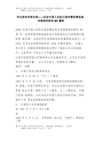【七哥公文】2025年:(党课PPT+讲稿)纪念中国人民抗日战争暨世界反法西斯战争胜利80周年课件:牢记使命 吾辈自强word+更多免费公文+VX:QiGeGongWen2024