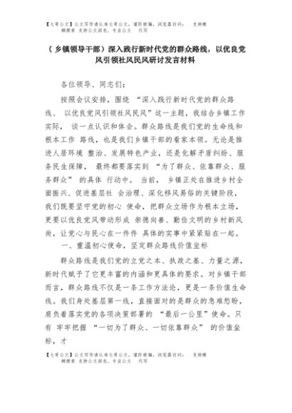【七哥公文】2025年:(乡镇领导干部)深入践行新时代党的群众路线,以优良党风引领社风民风研讨发言材料+更多免费公文+VX:QiGeGongWen2024