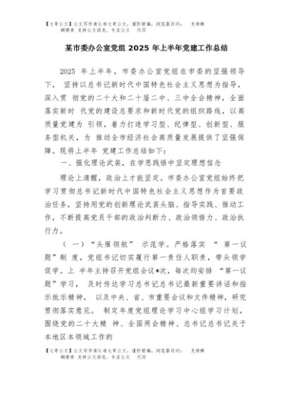 【七哥公文】2025年:(党课PPT+讲稿)某市委办公室党组2025年上半年党建工作总结word+更多免费公文+VX:QiGeGongWen2024
