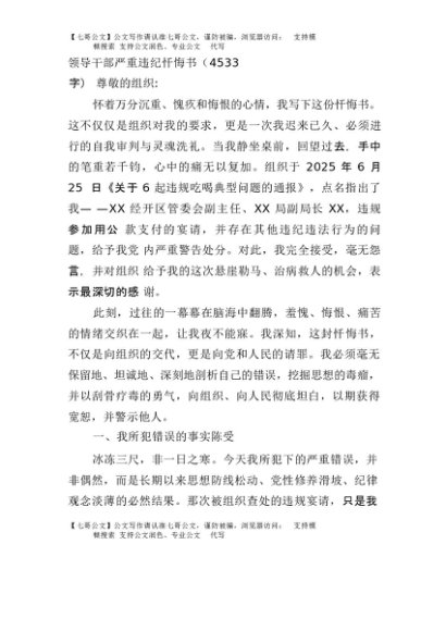 / 【七哥公文】2025年:领导干部严重违纪忏悔书(4533字)+更多免费公文+VX:QiGeGongWen2024