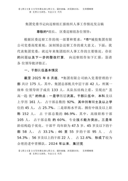/ 【七哥公文】2025年:集团党委书记向巡察组汇报组织人事工作情况发言稿+更多免费公文+VX:QiGeGongWen2024