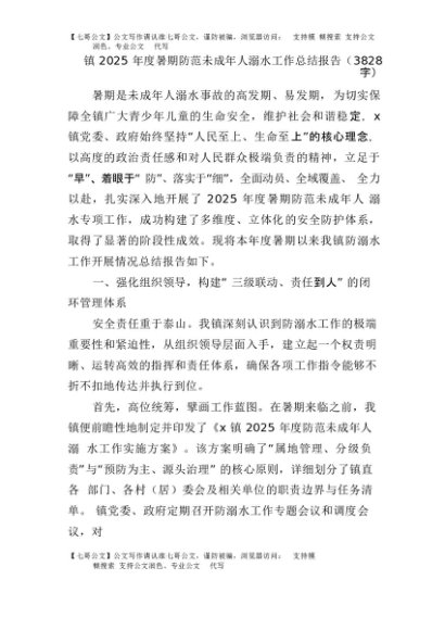 【七哥公文】2025年:镇2025年度暑期防范未成年人溺水工作总结报告(3828字)+更多免费公文+VX:QiGeGongWen2024