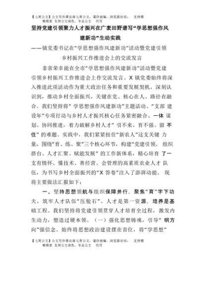 【七哥公文】2025年:镇党委书记在“学思想强作风建新功”活动暨党建引领乡村振兴工作推进会上的交流发言+更多免费公文+VX:QiGeGongWen2024