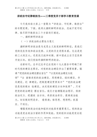 【七哥公文】2025年:(党课PPT+讲稿)三季度党员干部学习教育党课:讲政治守纪律敢担当word+更多免费公文+VX:QiGeGongWen2024