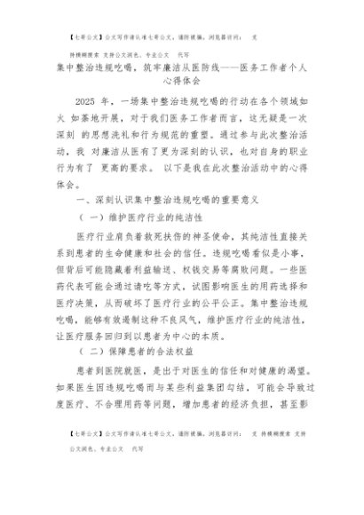【七哥公文】2025年:集中整治违规吃喝,筑牢廉洁从医防线——医务工作者个人心得体会+更多免费公文+VX:QiGeGongWen2024